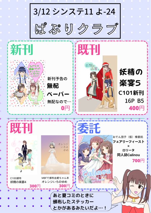 お待たせしましたーーー!!!!! 明日(というか今日)のシンステのお品書きです!!! 冬コミとほとんど変わりないです!!!! 無配ペーパーがあるので遊びに来てね!!!!! #シンステ11 #cin_stage #フェアリーフィースト