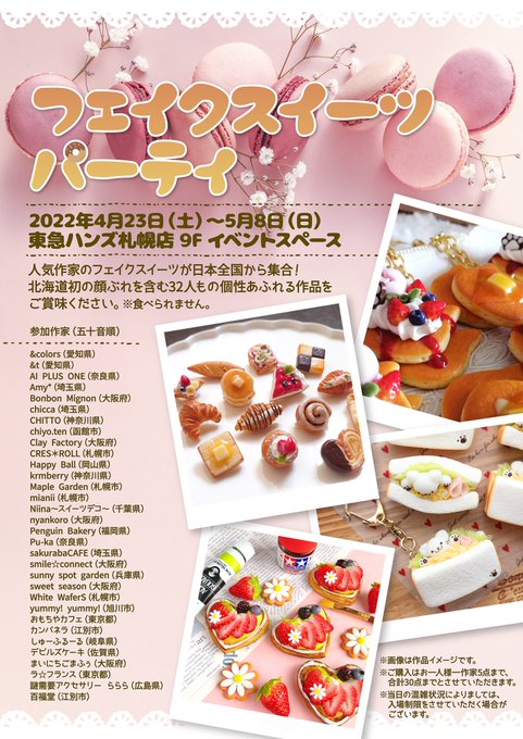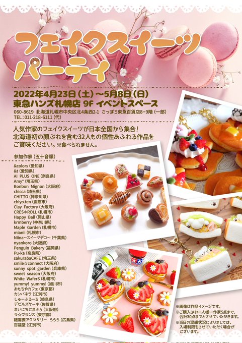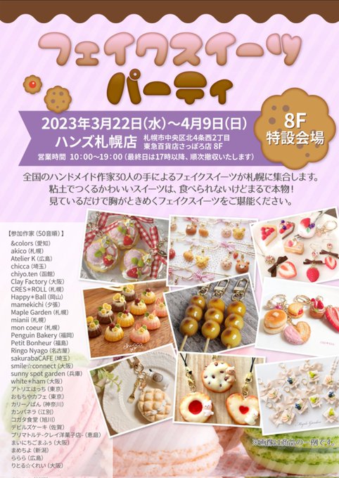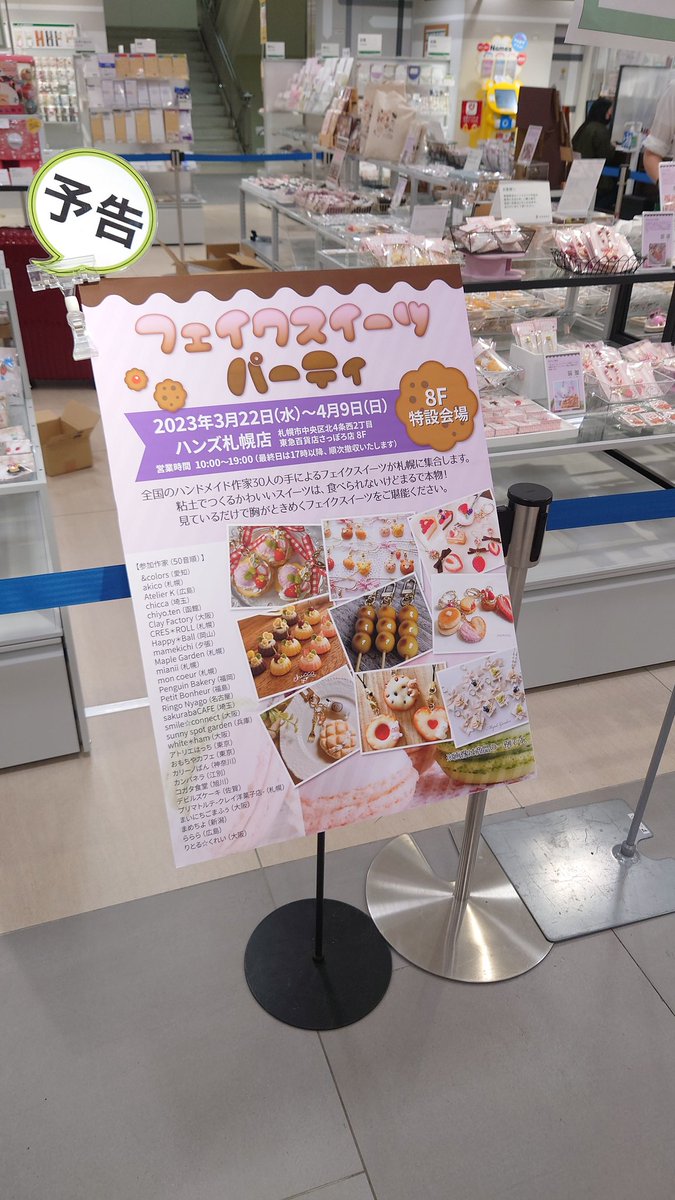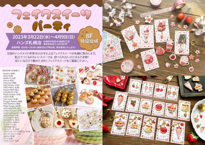 🍰3/22(水)〜4/9(日) #フェイクスイーツパーティ 🍰10:00〜19:00 #ハンズ札幌店 8F特設会場 全国のイベントで人気の作家さんの作品が今年も札幌にたくさん集まります😍北海道初の方やお久しぶりの方も…ぜひお楽しみに💖 お時間ありましたら、お立ち寄りくださいませ🥰✨