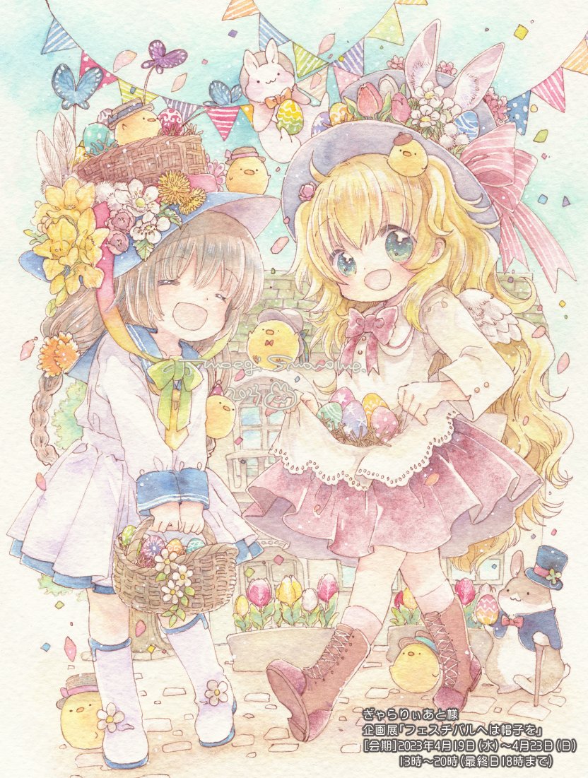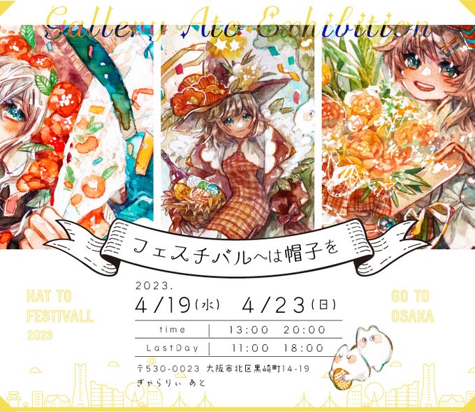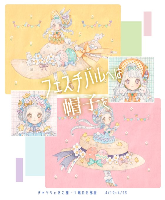 👒展示のお知らせ🐇 企画展「 #フェスチバルへは帽子を 」 𖦥大阪・ぎゃらりぃ あと様(@Ato10Gallery ) 𖦥 4月19日(水)~23日(日) 𖦥 13時~20時(最終日18時まで) 新作原画4点とグッズで参加いたします。春色パステルな作品たちを送り出しました🌷 よろしくお願いいたします。