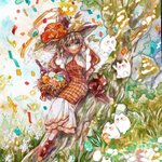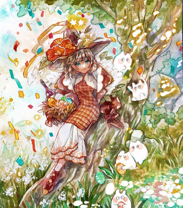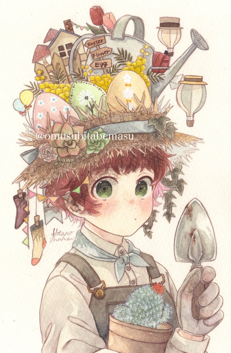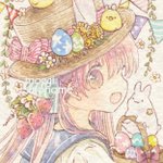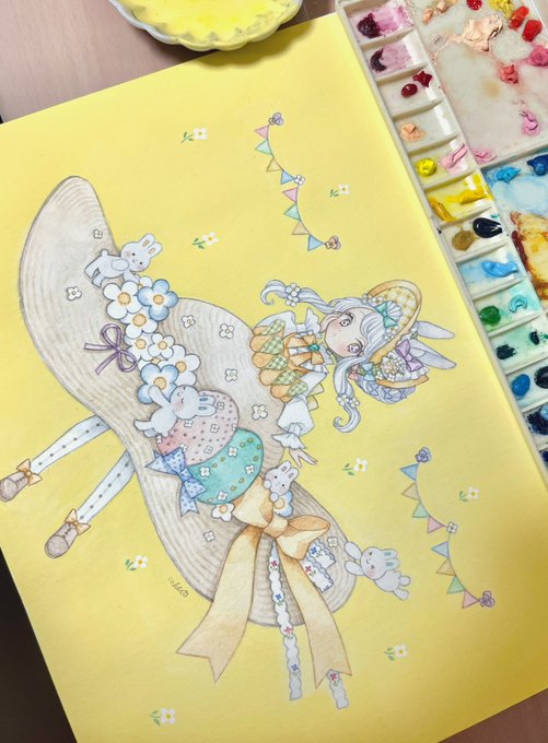 【展示告知】 4/19web-4/23sun ぎゃらりぃ あと 企画展「 #フェスチバルへは帽子を 」 新作3点+ドローイング3点で参加させていただきます🐰🥚 イースターっぽい&フェスチバルの華やかな雰囲気を描きました💐右側の作品は名刺と、ポストカードを置かせていただいています。 よろしくお願いします~