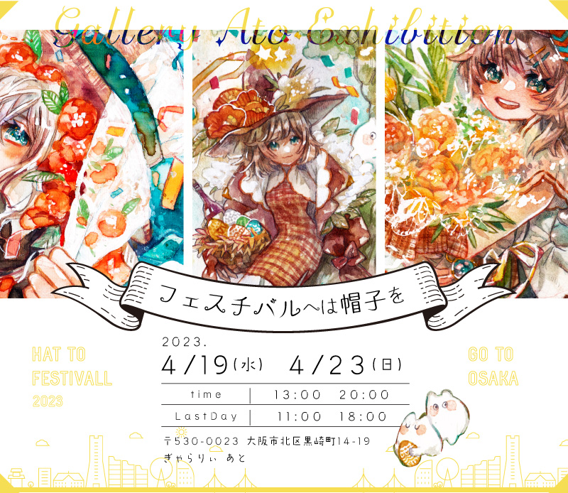 ぎゃらりぃあと様企画展 「#フェスチバルへは帽子を」に参加させていただきます👒 ◆4/19(水)〜4/23(日) ◆12:00-20:00(最終日18:00まで) ◆ぎゃらりぃあと様(@Ato10Gallery)一階のお部屋 額装2点(非売)、ミニ原画2点、ドローイング一点で参加させていただきます。よろしくお願いします🌸