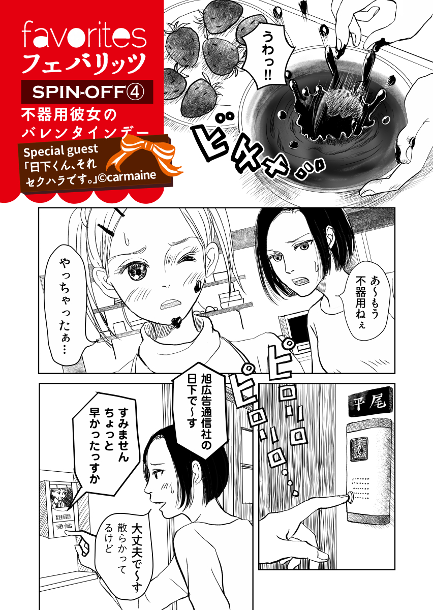 #フェバリッツ スピンオフ④不器用彼女のバレンタイン(#日下くんそれセクハラです コラボ) carmineちゃん作漫画も追加⭐️ pixiv pixiv.net/artworks/97125… LINEマンガ manga.line.me/indies/book/ar… & #たぶん違う(A5/72p冊子+オマケ付)BOOTHで販売中 makiweb.booth.pm/items/3482806 #たぶちが 最新話はネット未公開