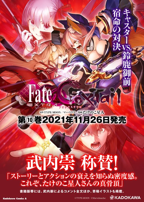今月26日発売の「フェイト/エクストラ CCC FoxTail」10巻に向けて宣伝画像を作ってもらいましたやったー! 武内さんの帯コメ(一部)、褒めてもらってますぞやったー! よろしくおねがいします。 #フォックステイル KADOKAWAさんのページ kadokawa.co.jp/product/322108… amazonとか amazon.co.jp/dp/4041121086/
