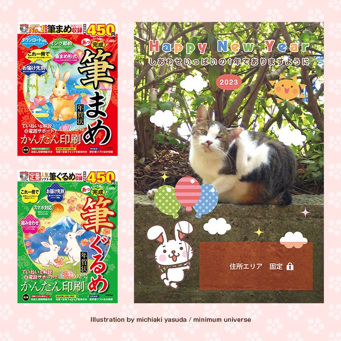 株式会社技術評論社さま発行の「あっという間に完成!筆まめ年賀状 2023年版」と「あっという間に完成!筆ぐるめ年賀状 2023年版」2冊でフォトフレーム年賀1点を描きました🐇 P42に掲載されています gihyo.jp/book/2022/978-… gihyo.jp/book/2022/978-… #年賀状 #フォトフレーム #卯 #卯年 #イラスト
