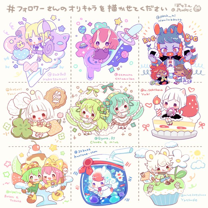 みんなの創作キャラ描かせていただきました! 合いそうなお菓子や食べ物考えたりいろんな子描けて楽しかった!です!!🍭🍚🎶 タグのテンプレ無視ですみません🙇♂️ #フォロワーさんのオリキャラを描かせてください
