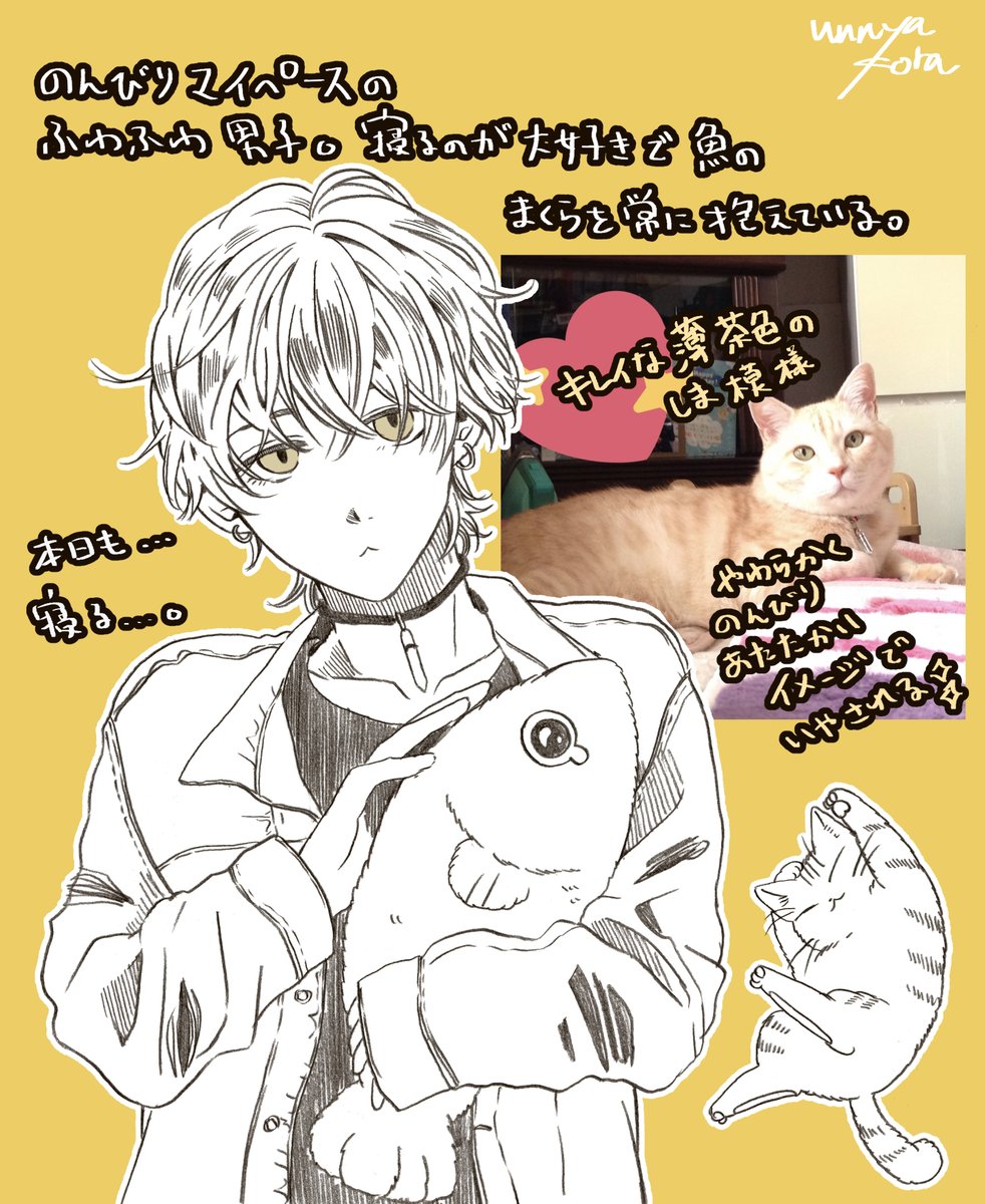 #フォロワーさんのペット擬人化お絵描きチャレンジ @rairai071231 かわいいおねこさん擬人化妄想させて頂きました!! 可愛い系男子で描いたつもり…💦 のんびりでよく寝てたとのことだったので眠たそうな目でふわふわイメージ😪✨ リクありがとうございました~✨