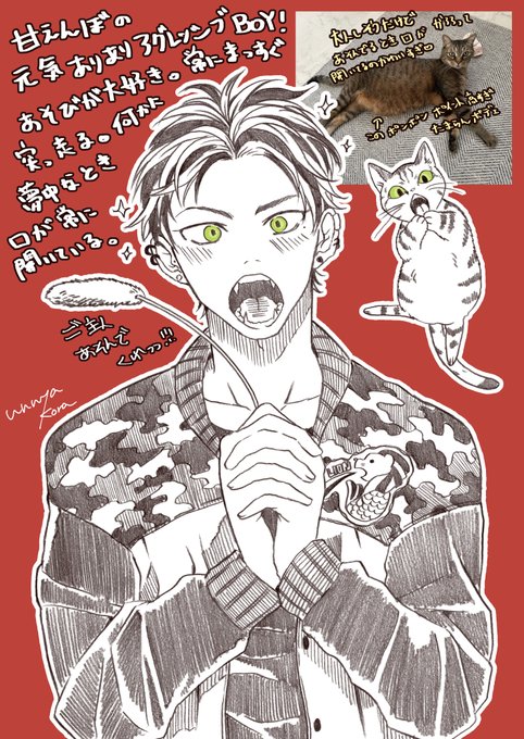 #フォロワーさんのペット擬人化お絵描きチャレンジ @masagon_baby おまたせです!可愛い猫さん擬人化予想描かせて頂きました! 口をぽっかり開けながらアグレッシブに遊ぶ猫さんですっ😻 元気そうなイメージで、可愛い印象のある男の子ぽく描きました😊 リクありがとうございました~🙏