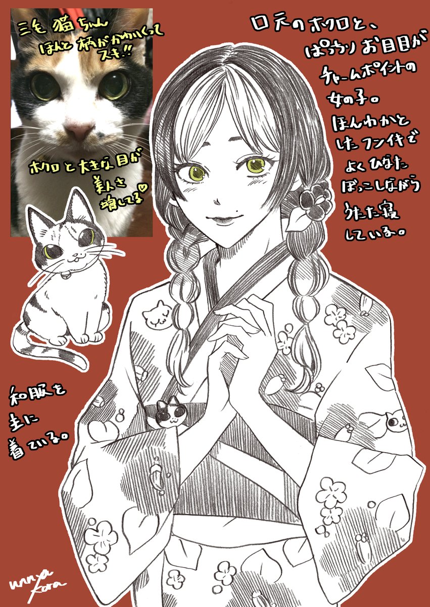 #フォロワーさんのペット擬人化お絵描きチャレンジ @yu____cco105 おまたせしました!可愛い猫さん擬人化予想描かせて頂きました! 猫ちゃんでは紅一点です!三毛猫大好きなのでウハウハと和服おさげ女子に仕上げました🐈✨気に入ってくれると嬉しいです。 リクありがとうございました~😊