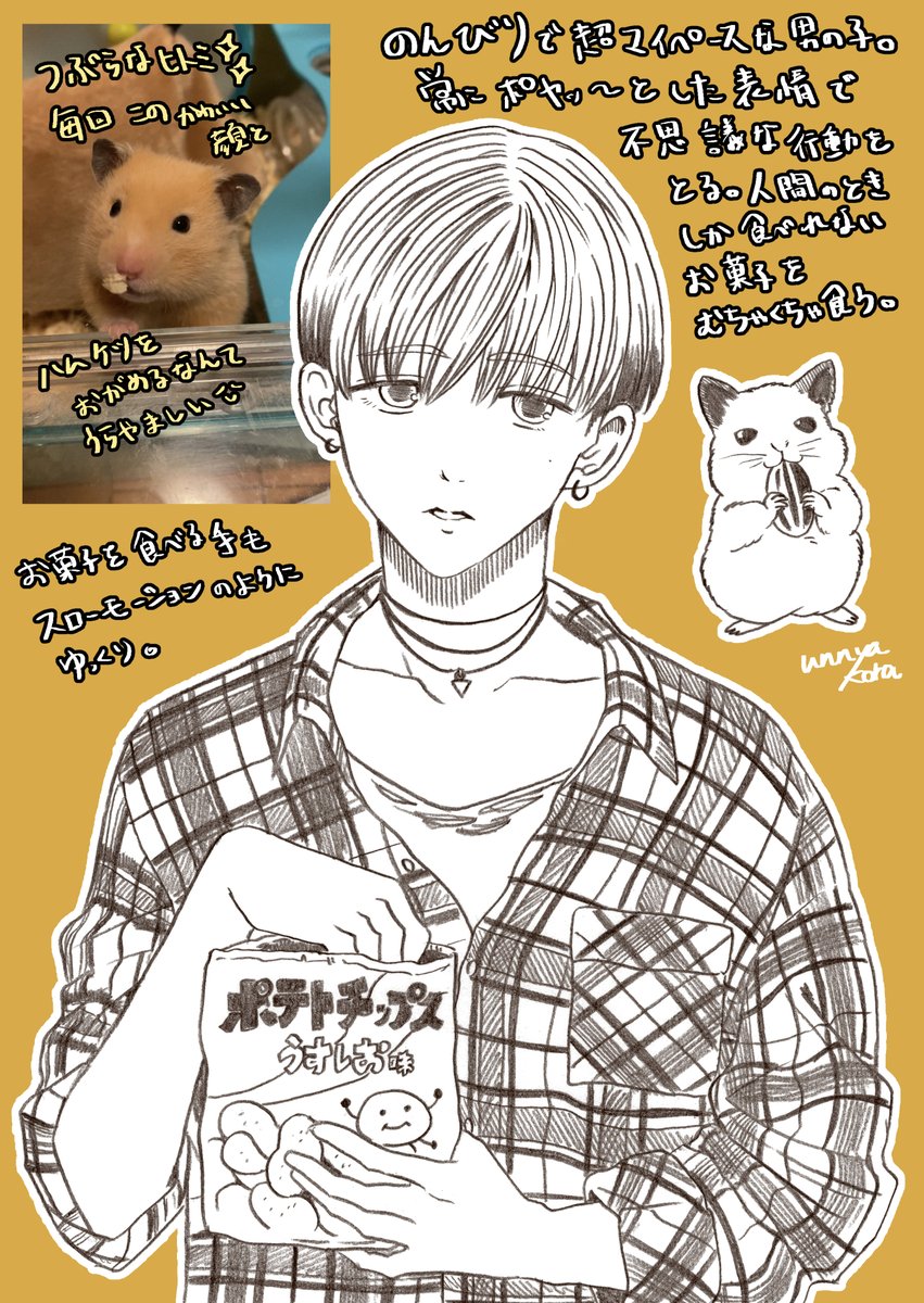 #フォロワーさんのペット擬人化お絵描きチャレンジ @tsuki_s8 おまたせしました!可愛いハムさん擬人化予想描かせて頂きました!🐹 とってものんびり屋で不思議ちゃんとのことだったのでちょっと眠そうな顔の男の子でイメージしてみました😊 リクありがとうございました~😆✨
