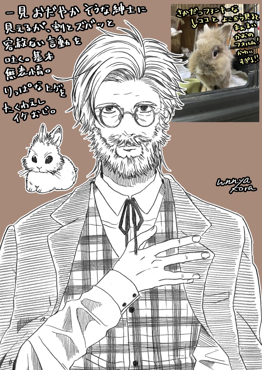 #フォロワーさんのペット擬人化お絵描きチャレンジ @kh_5pg 大変お待たせしました!可愛いうささん擬人化させて頂きました🐰 おじいちゃんうさぎということで私の好みも混ざってますがかっこいいおじいちゃんを目指しました… フォルムがかわいすぎるうささんのリクエスト、ありがとうございました!!