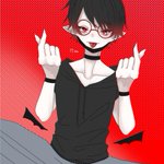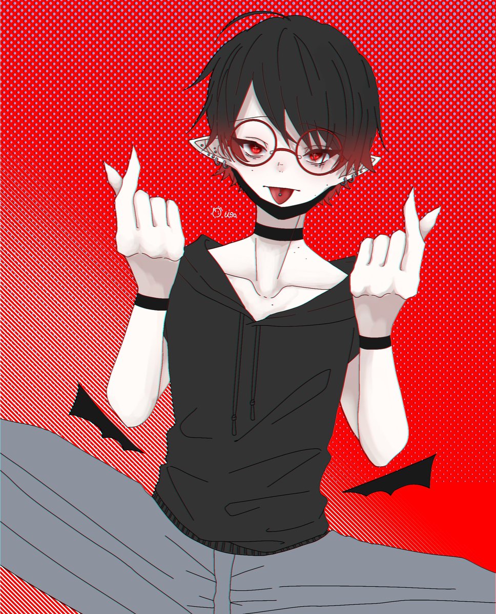 #フォロワーさんの好きな要素を詰め込んだ創作男子を描く 両目の下泣きぼくろ、ベルト、黒髪、赤目、黒手袋、ジト目、八重歯、眼鏡、髪の毛耳掛け、ぱっつん前髪、まつ毛長め、でした!! (自分の好みで少し別要素も入れてアレンジしました)