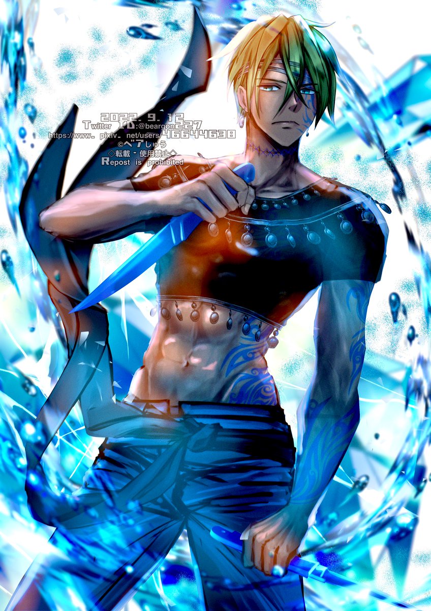 #フォロワーさんの好きな要素を詰め込んだ創作男子を描く #イラスト 筋肉、黄緑の髪、氷のように冷たいイケメンの3つ頂きました😇 氷の様に…?なってないかも🥹 なんか余計な要素入れまくってしまった🥹趣味に走る 肌バン対策でTwitterには服着せてますがpixivでは脱いだのも載せます😇後でUP予定 twitter.com/beargon227/s…