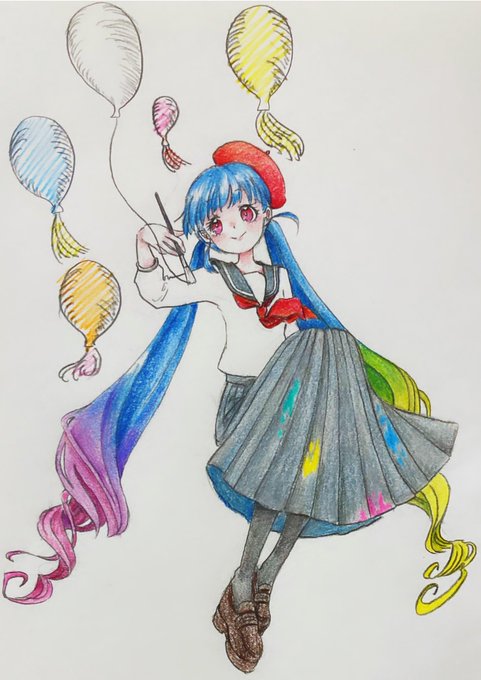 #フォロワーの絵柄で見たいまじふぇすっ子 ギリギリになってしまいましたが、宮崎っ子の百合ちゃんを描かせていただきました💕 百合ちゃんが描いてる風船みたいなのの元ネタは宮崎出身の画家・瑛九の《旅人》です🙌