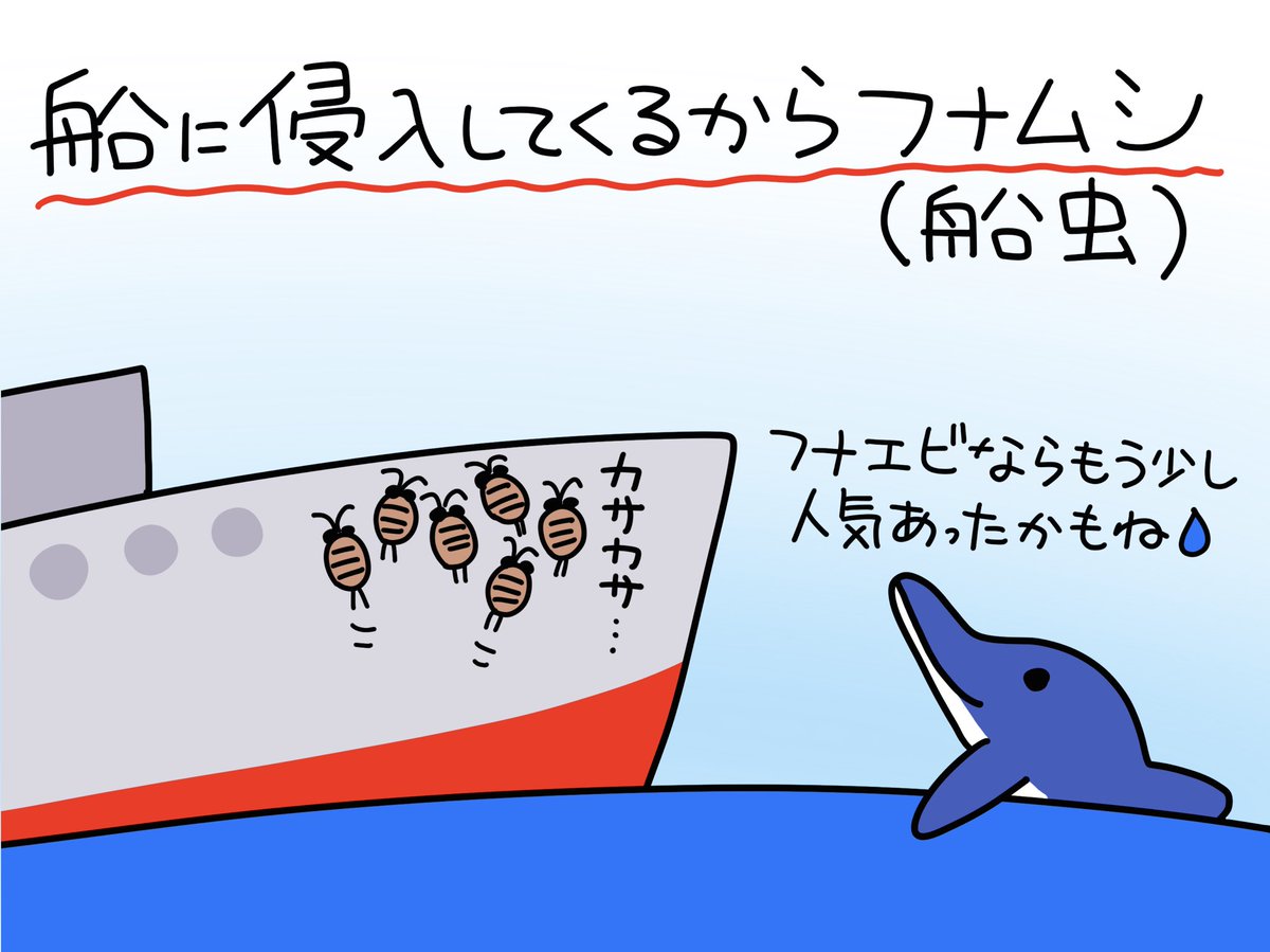 意外と知らない事実!フナムシの名前の由来は…船に侵入してくる虫→船虫→フナムシ😱😱でもフナムシは虫ではなく甲殻綱の一種です✨ #魚のイラスト #イラスト #フナムシ #ダイビング #苦手な人多いよねぇ #フナエビなら人気あったかも