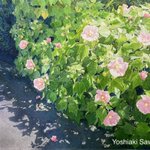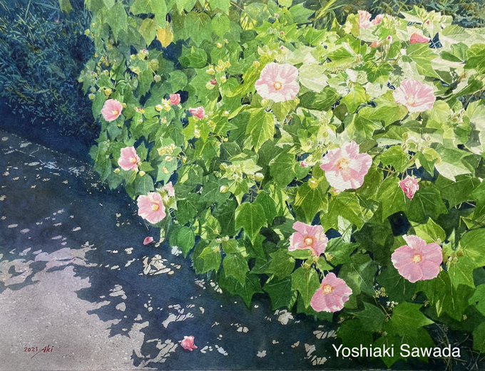 水彩画「道端に咲く〜芙蓉〜」F6 ワンコの散歩コースに咲いていたフヨウを描きました。眩しいくらいの日差しを浴びて輝いていました。2021年の作品です。 #水彩画 #透明水彩 #風景画 #自然 #花 #フヨウ #watercolor #watercolorpainting #aquarelle #art #paint #painting #gallery