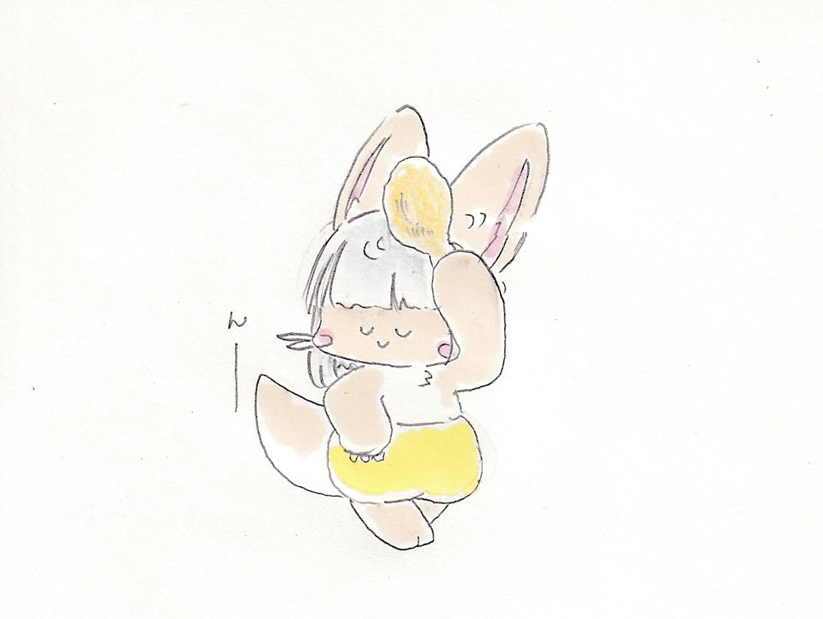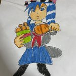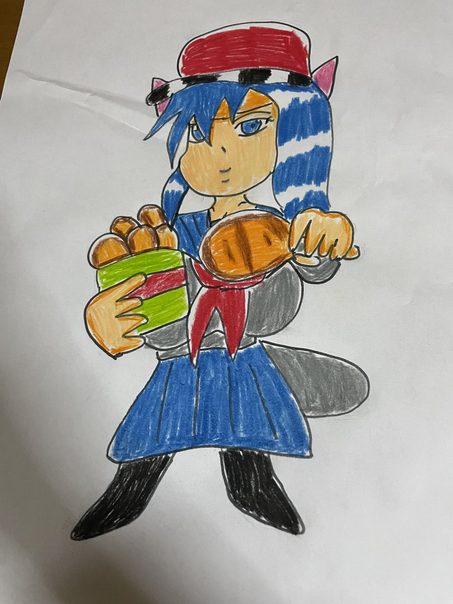 #一日一絵 #毎日絵一枚上げる #イラスト #色鉛筆画 #オリキャラ #イラスト好きな人と繋がりたい #絵描きさんと繋がりたい #フライドチキンの日 アチネルケンタッキー 西部大陸出身のセーラー服戦士であり猫の獣人 フライドチキンが好物 強羅丸と昔どっかで会った事がある