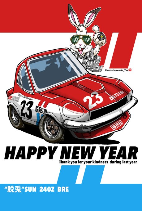 お待たせしました (。・人・`。))ゴメンネ 『全日本干支にちなんだクルマイラスト年賀状普及委員会』第10回イラスト年賀状は... "脱兎"SUN 240Z BRE に決定!! アロハのファンキーオーナーも健在です。 無料ダウンロード↓ illustyuz.stores.jp/items/639efa23… #イラスト #年賀状2023 #フリーダウンロード