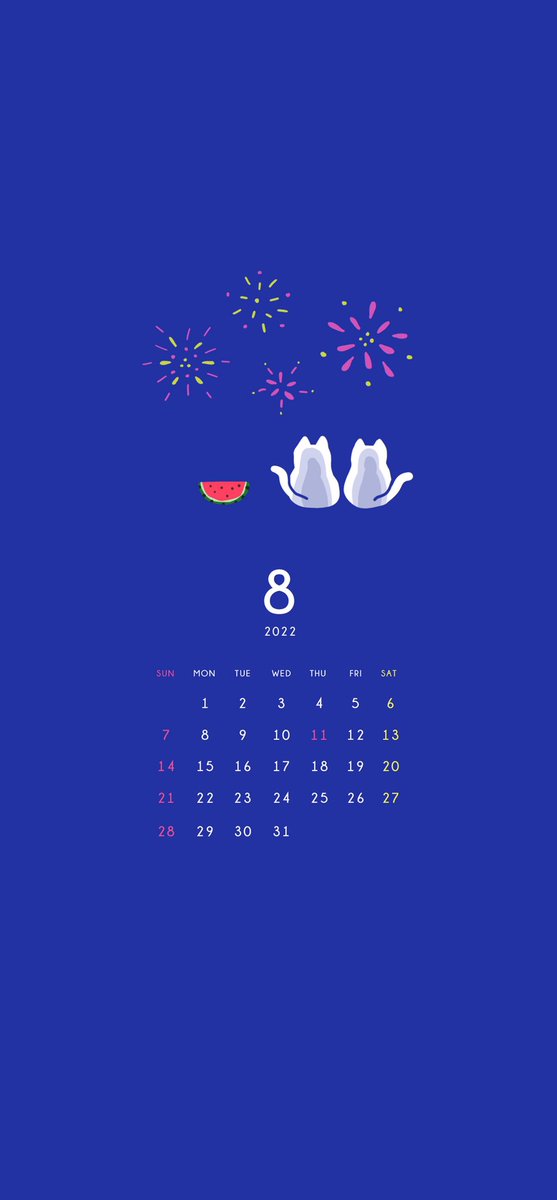 8月のスマホ用カレンダーフリー待ち受けを制作しました! 今年は花火大会が開催される地域も多いのではないでしょうか🎆 保存してぜひご活用ください( ¨̮ )♡ #イラスト好きな人と繋がりたい #絵描きさんと繫がりたい #イラスト #フリー待ち受け #illustration