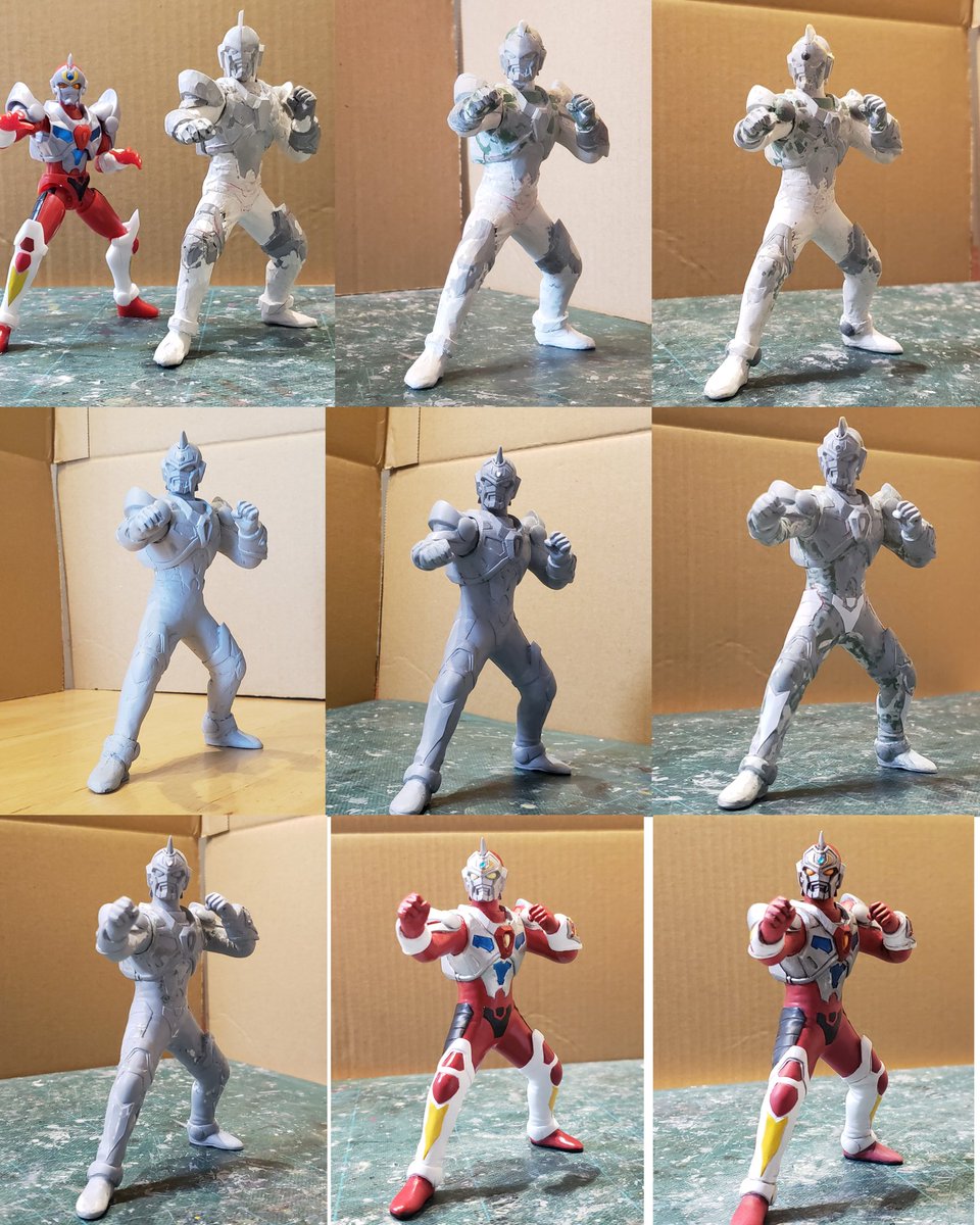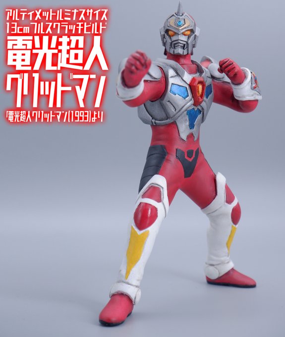 【完成(1/4)】#フルスクラッチ #電光超人グリッドマン(13㎝)完成!制作期間約1ヶ月。ファンド、エポパテ、プラ板で制作。初の人型ヒーロー、シワや表面処理など課題もありますが、これが現状の精一杯!制作中にルミナス版発表で心折れかけましたが、一足先に完成できて満足です!ぜひご覧ください!