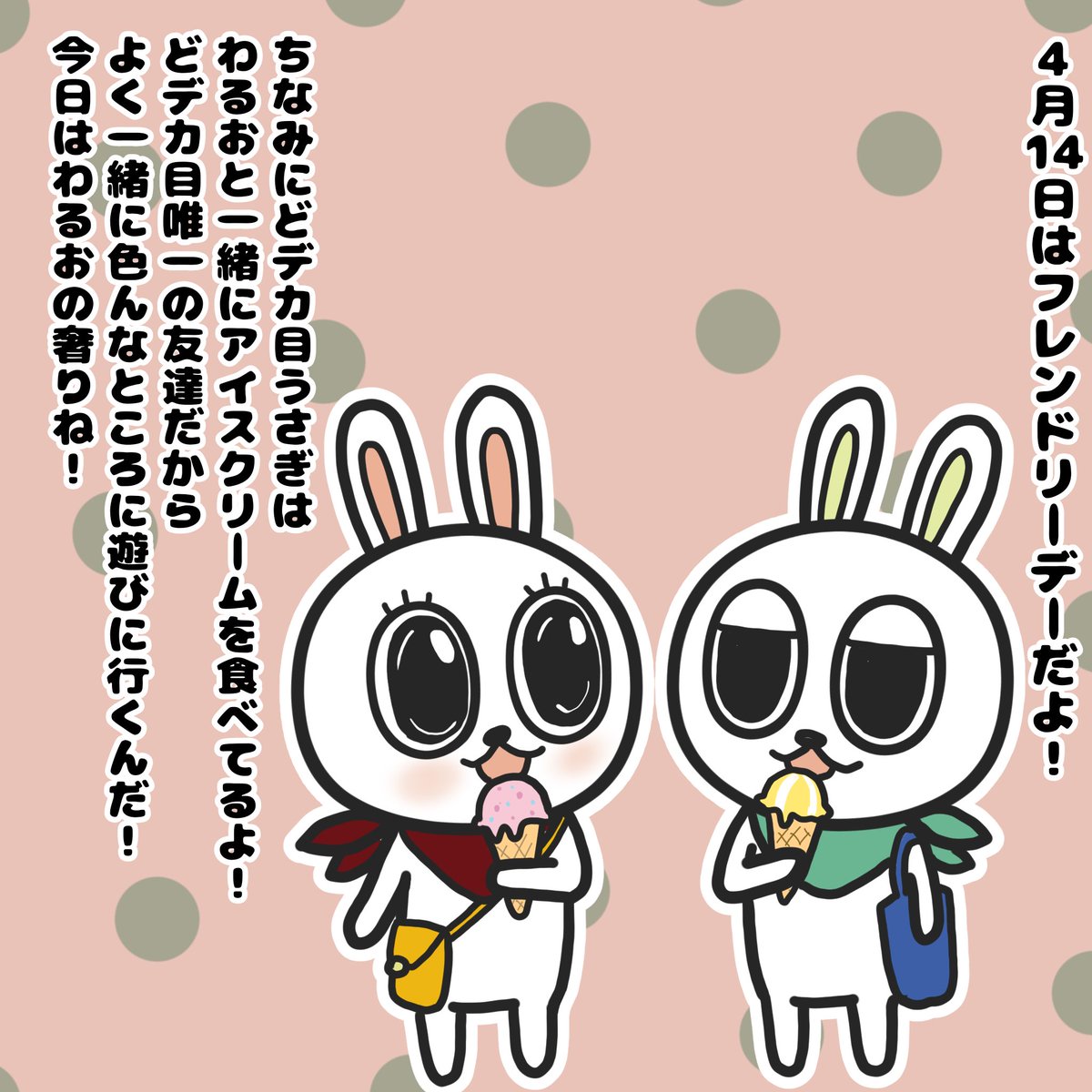 おはようございます✨ どデカ目うさぎはお友達と遊んでるね✨どこにいくのかな❓ #イラスト #どデカ目うさぎ #イラスト好きさんと繋がりたい #illustration #みんなで楽しむTwitter展覧会 #フレンドリーデー