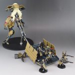 フレームアームズ・ガール ドゥルガー 完成! ウォーハンマーのミニチュアと並んで飾れるFAガール、がコンセプトです 25mmベースのミニチュアを後部荷台に6体搭載できます 荷台は昇降できるようにしましたが、6mvくらいスキタリは飛び降りてくれると信じています #フレームアームズ・ガール