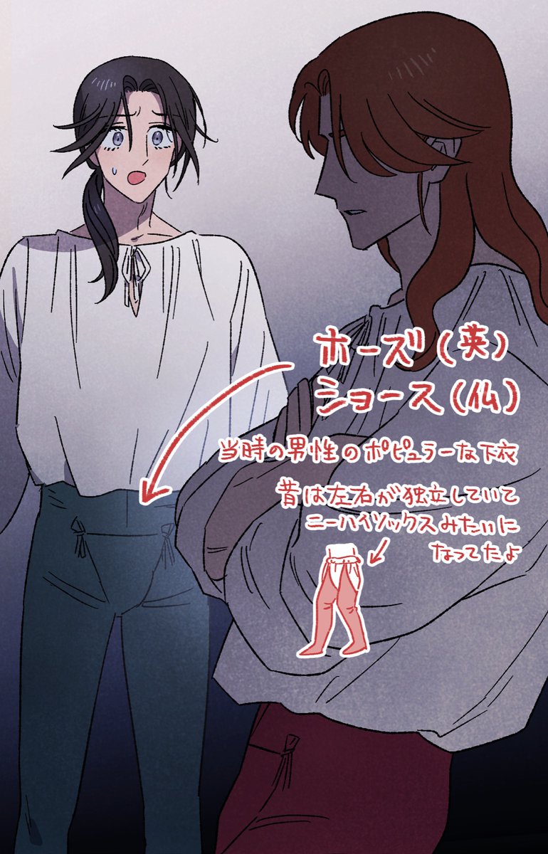 ラザロ達が履いているホーズ(ショース)、51話で全体をお見せできてよかった👖(39話冒頭でもレオナルドがちょっとだけ見せています) 普段は丈の長い上品な服を着ているからちょっとしか 見えないんだ…! #フローラの白い結婚