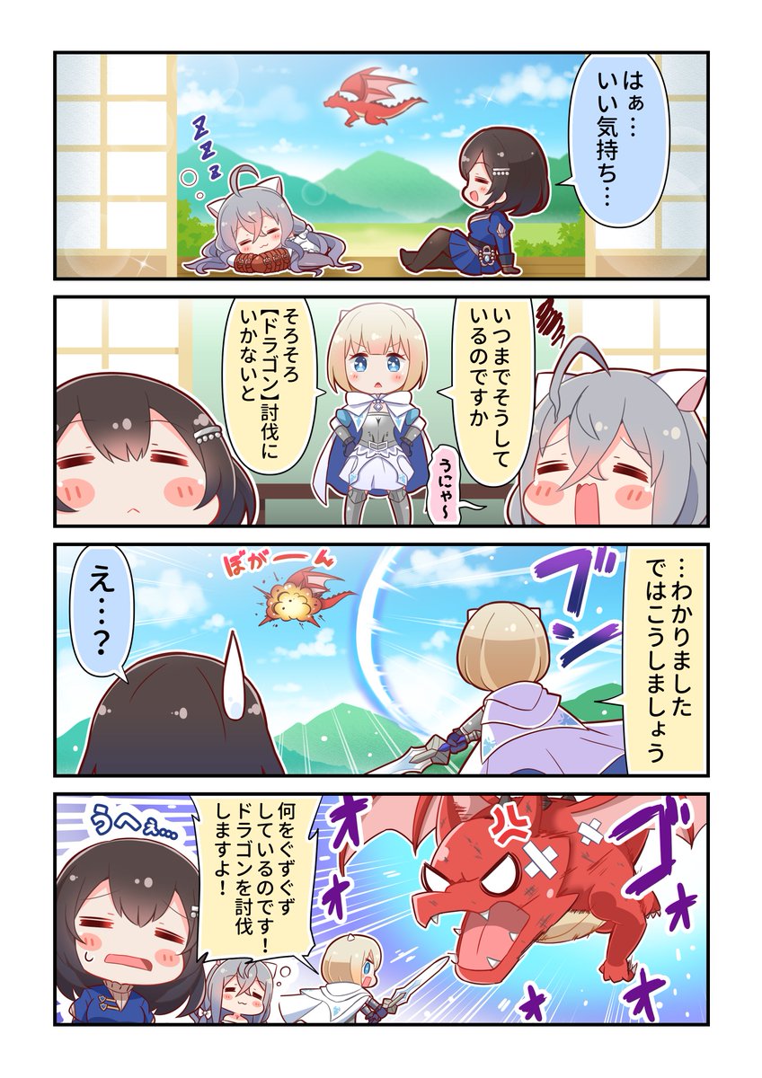【ブラウンダスト4コマ】 EP.3「もしかして…五月病?」を公開しました! やる気が出ないときはドラゴンと強制的にバトルすればいいんです!(?) 事前登録はこちらから! bit.ly/415vFT6 #ブラウンダスト2