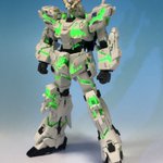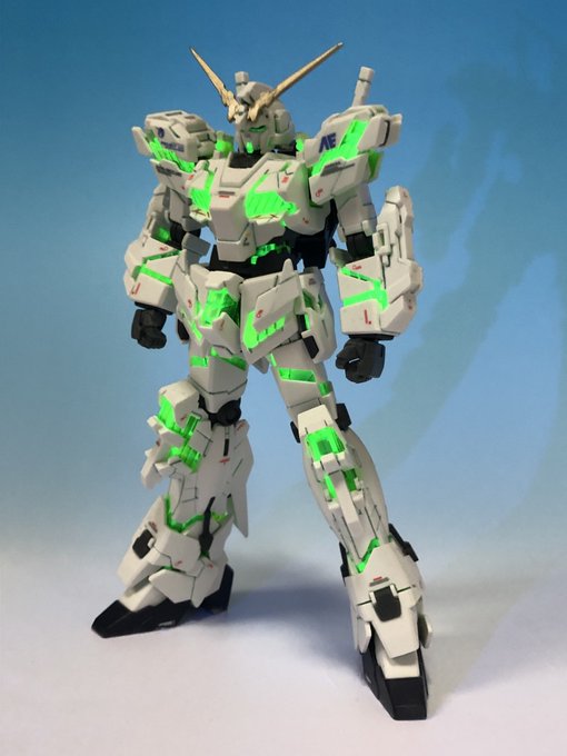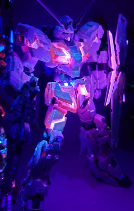 MGユニコーン。蛍光塗料とブラックライトで遊んでみる。サイコフレームが鮮やか。 #蛍光塗料 #ブラックライト #ガンプラ #ガンプラ好きと繋がりたい #ガンプラの画像貼るとRTされると聞いて #ユニコーンガンダム