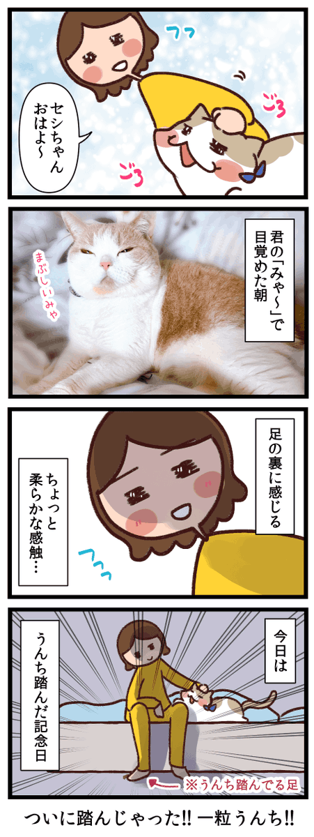 君が落としたアレを踏んだから… 今日は◯◯◯踏んだ記念日💩 他の猫マンガはこちら→bokuneko-cat.blog.jp #コミックエッセイ #漫画が読めるハッシュタグ #猫好き #猫好きさんと繋がりたい #ブリティッシュショートヘア #猫のいる幸せ #猫漫画 #猫との暮らし #猫あるある