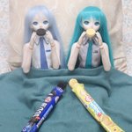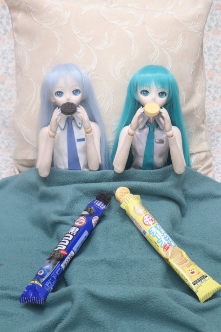 #深夜の初音ミク撮影60分一本勝負 2/12のお題【休日】#深夜のドール撮影60分一本勝負 2/12のお題【フリー】フライング #ブルボンプチ @Bourbon_JP ミク・ユキ「今日は暖かったですねー、まったりお菓子タイム」