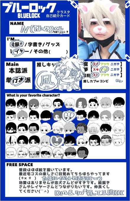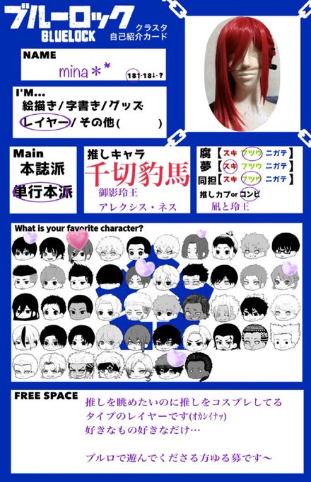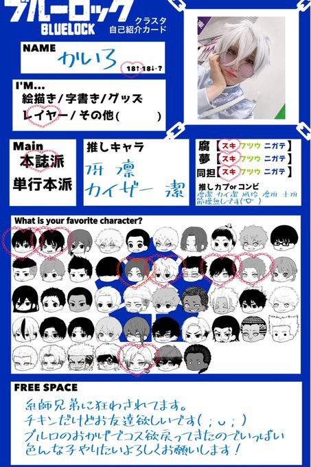 ブルロ界隈のお友達少ないのでど新規ですが仲良くして頂けたらうれしいです🥲💓 おたく兼レイヤーです🐈⬛🎀 ♡、RT中心にまわります! #ブルロ好きさんと繋がりたい #ブルロクラスタカード #ブルロレイヤーさんと繋がりたい #ブルーロック絵描きさんと繋がりたい #ブルーロック好きと繋がりたい