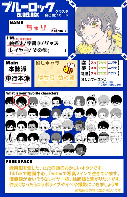 ブルロ⚽️レイヤー様、絵師様、 コメorRTで気になった方、DMします🙏 レイヤー様は価値観が合いそうな方と TikTok LIVEや撮影やイベに行きたいです。 絵師様は一緒に何か企画ができたらなと🙇♀️福岡中心に活動してる🐝レイヤーです!ご縁がありますように👏 #ブルロレイヤーさんと繋がりたい