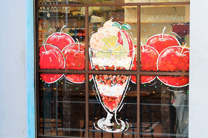 過去絵だけどアップしておく。改めて描いたらまた。 以前パフェ屋さんのガラスに描いたリンゴパフェ。 #ブルーピリオドターナー #あなたの描くりんごを見せてください #ウィンドウアート #イラスト #ターナー #アクリルガッシュ