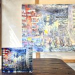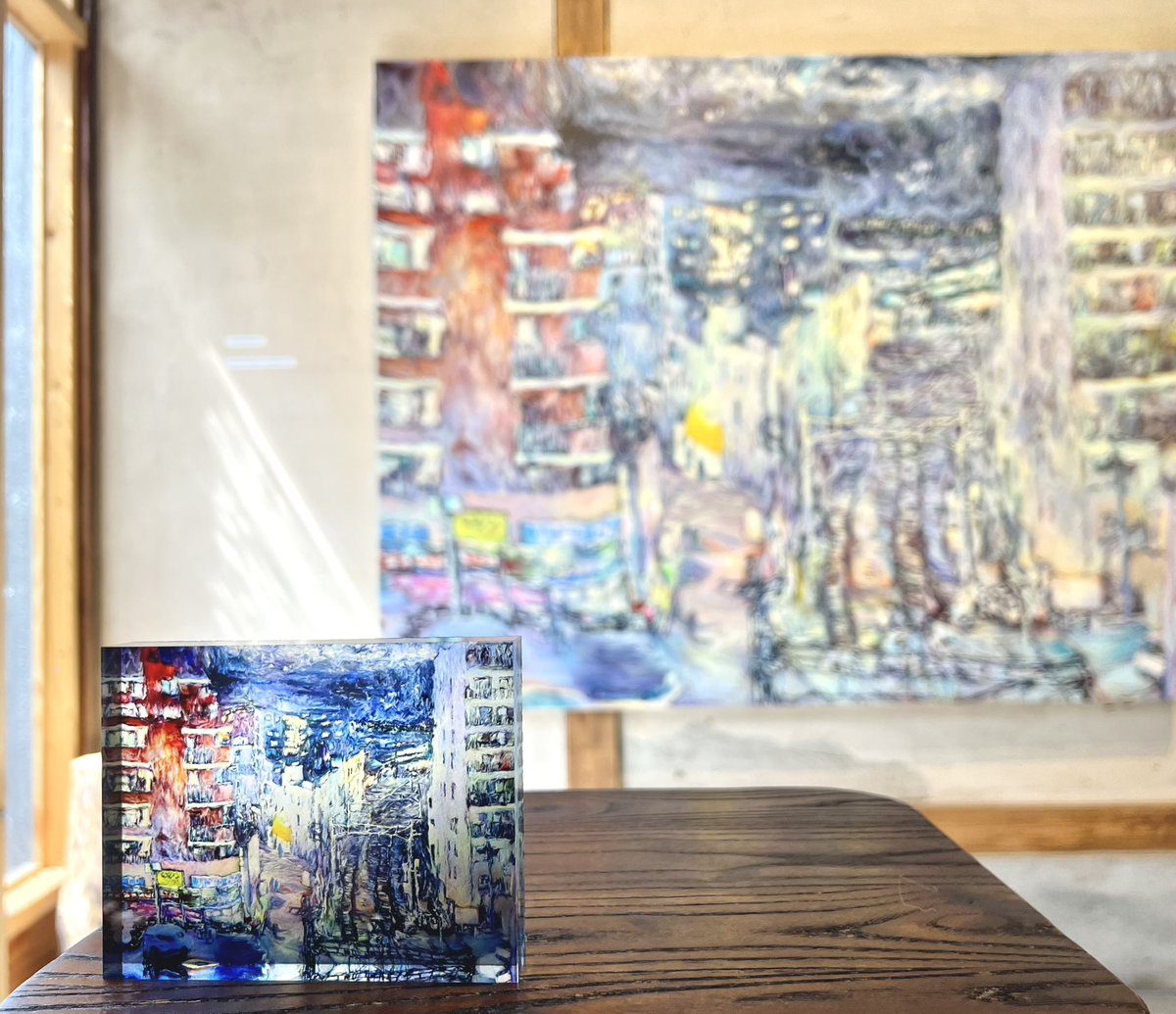 茂木たまなさんが池上の街並みを描いた新作100号の油彩画がミニチュアになりました〜 茂木さんが描いたドローイングのノベルティトートバッグも残りわずかで寿 ※1ドリンクオーダーでノベルティトートバッグを差し上げてます @motetamahonmono #ブルーピリオドミュージアムショップ #ブルーピリオド