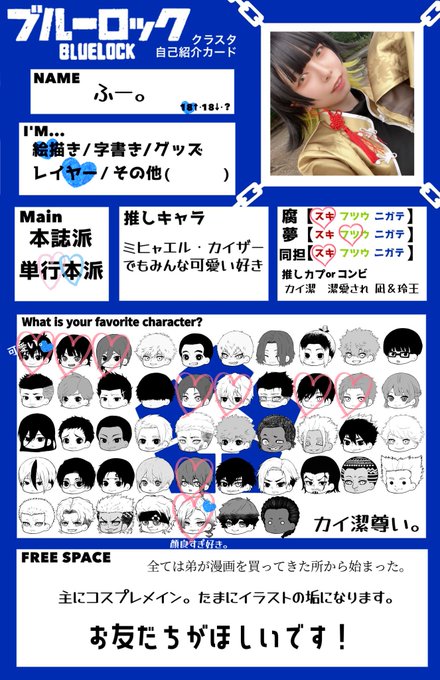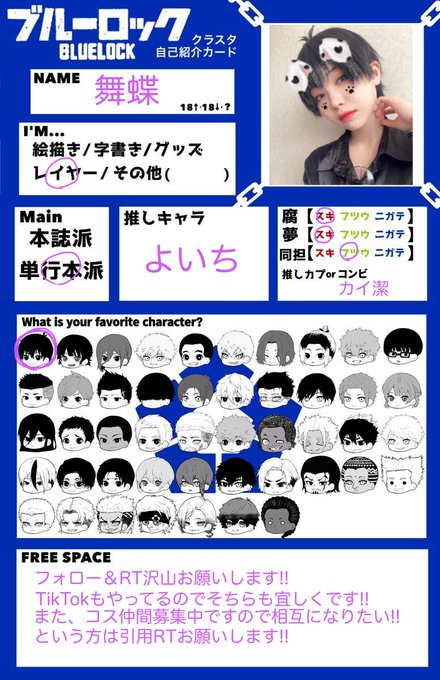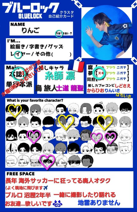 念願のタグします😭🏷𓈒𓏸︎︎︎︎ 自己紹介カード書くの夢でした⚽️♥️ ブルロの友達いっぱい欲しいです 苦手なものなどは無いです‼️‼️ 4️⃣1⃣右大好きですよろしくお願いします #ブルーロック好きな人と繋がりたい #ブルロレイヤーさんと繋がりたい #ブルーロック好きさんと繋がりたい