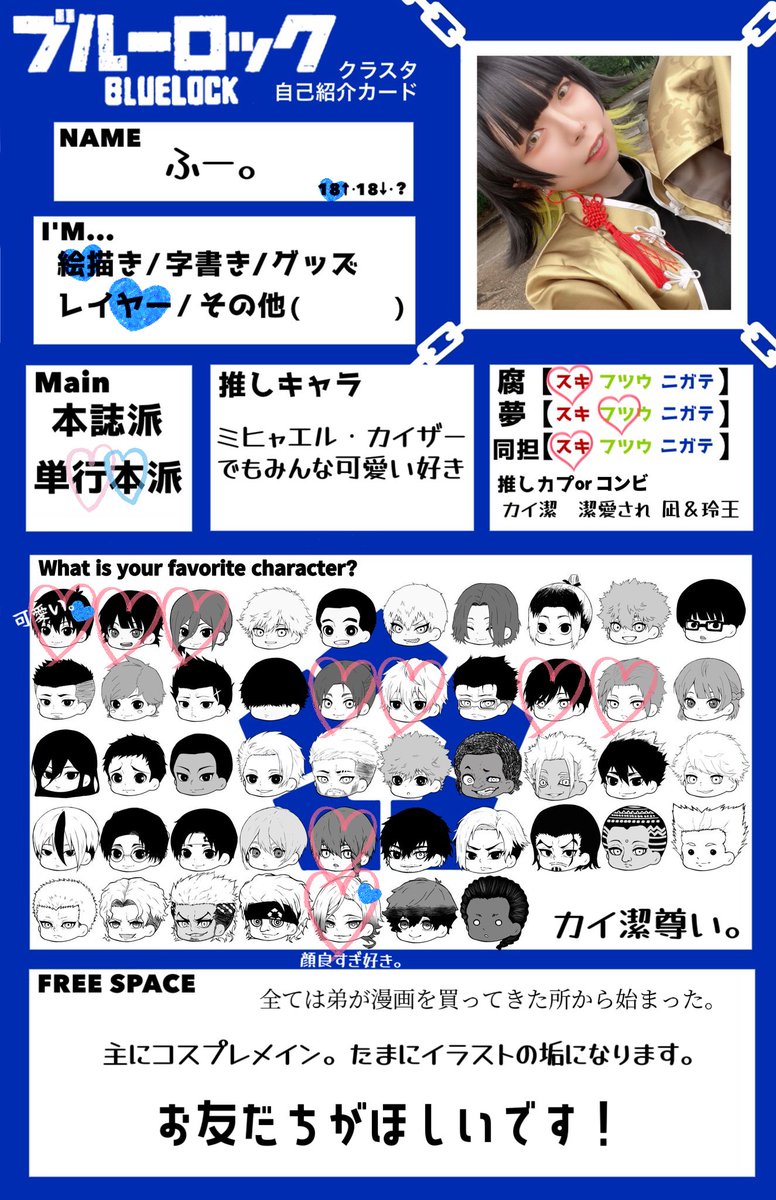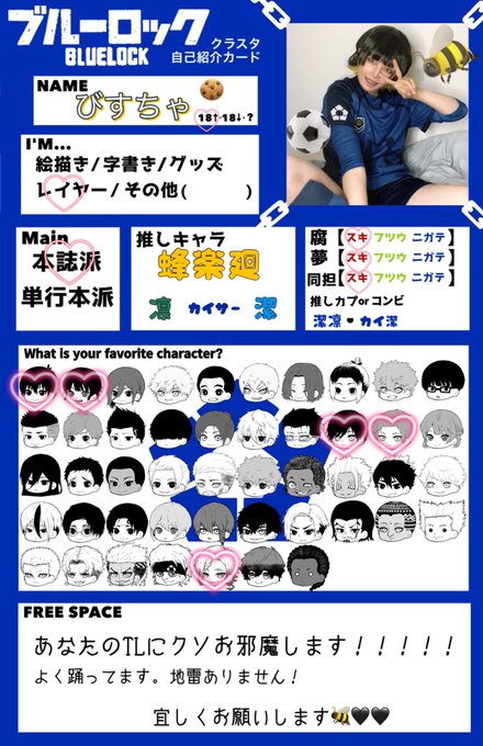 ブルロ沼にどっぷりハマりました。 沢山コスするようになったのでタグ出させて頂きます🐝🖤 コスイベ、パフォイベよく行きます!! 仲良くして頂けると嬉しいです! RT中心に♡も回らせて頂きます🎶 #ブルロレイヤーさんと繋がりたい #ブルロクラスタカード #ブルーロック好きな人と繋がりたい