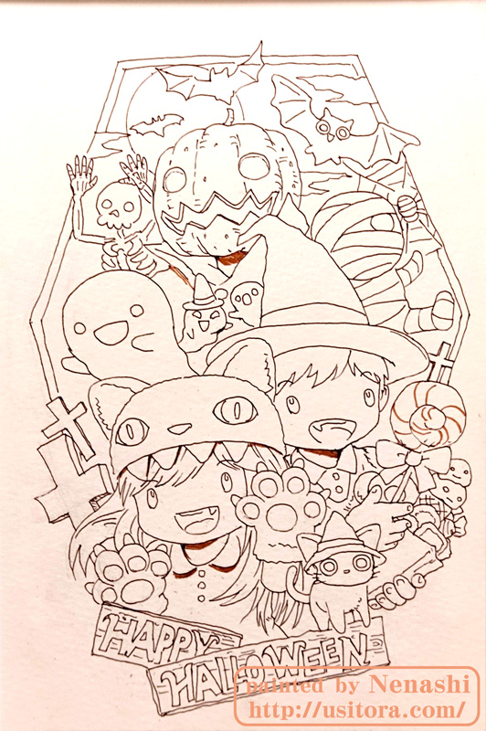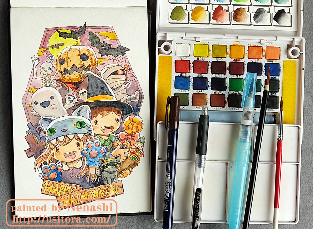 ハッピーハロウィーン! Happy Halloween! 主線はサラサクリップのセピア色 着色はサクラクレパスの #プチカラー 水彩絵の具 #halloween2021 #ハロウィンイラスト #Halloween #illustration #ハロウィンイラスト展示会2021 #ハロウィン2021 #透明水彩