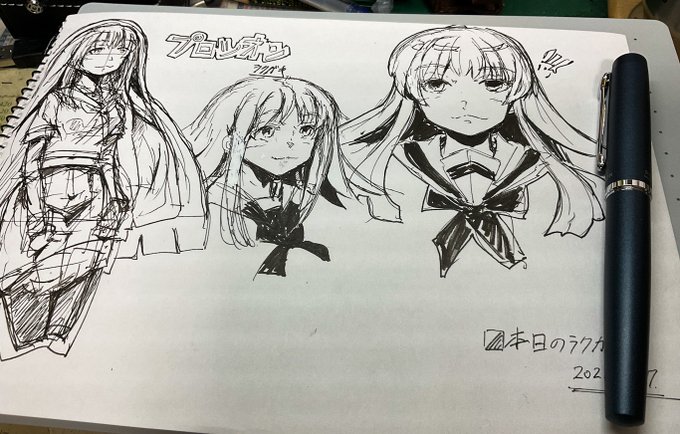 【本日のラクガキ作業風景】オリキャラで描いてみた少女のラクガキ。百均のスケッチブックに万年筆で一発描きで描いています。万年筆は久々にプラチナ万年筆のプロシオンで描きました。 #プラチナ万年筆 #万年筆 #イラスト好きさんと繋がりたい #絵描きさんと繋がりたい #セーラー服 #女子高生