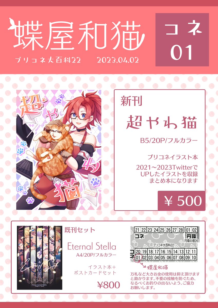 🔔【お知らせ】🐈 4/2(日)プリコネ大百科22のお品書きです! 🦋サークル『蝶屋和猫』は『コネ01』でお待ちしております!🐈 新刊と既刊セットを持っていきます! 当スペースにお立ち寄りの際は2枚目のポスターを目印にしてくださいませ〜〜! 当日よろしくお願いいたします✨ #プリコネ大百科22