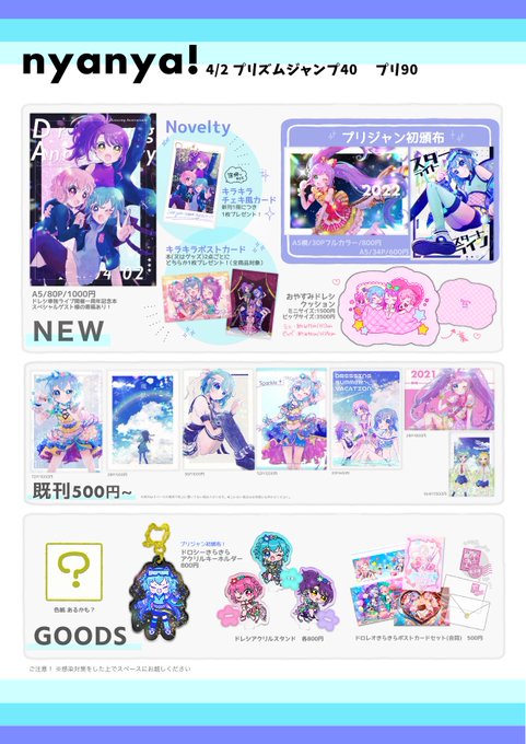 #プリジャン40 【nyanya!】お品書きです✧* ___ ▼新刊 ドレシ単独一周年記念本 twitter.com/ymncrn/status/… ▼新グッズ ドレシクッション twitter.com/ymncrn/status/… ▼通販 yuinyan.booth.pm ___ 冬コミの新刊もプリジャン初頒布です⛄️ノベルティもあります♡ 当日はよろしくお願いします💙 twitter.com/ymncrn/status/…
