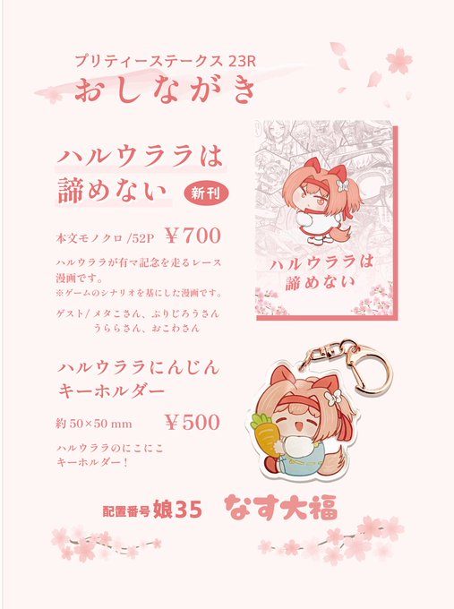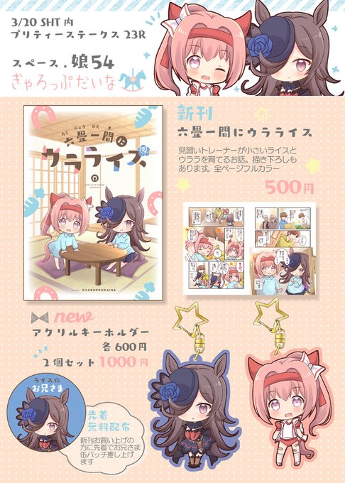 【プリステ23Rお品書き】スペース.娘54 ぎゃろっぷだいな 新刊は小さいウララとライスを育てるお話。新刊はメロンさんアクキーはboothでも頒布します。リプ欄にお品書きに載ってないアクスタの情報追記します 【メロンブックス】melonbooks.co.jp/detail/detail.… #プリステ23R