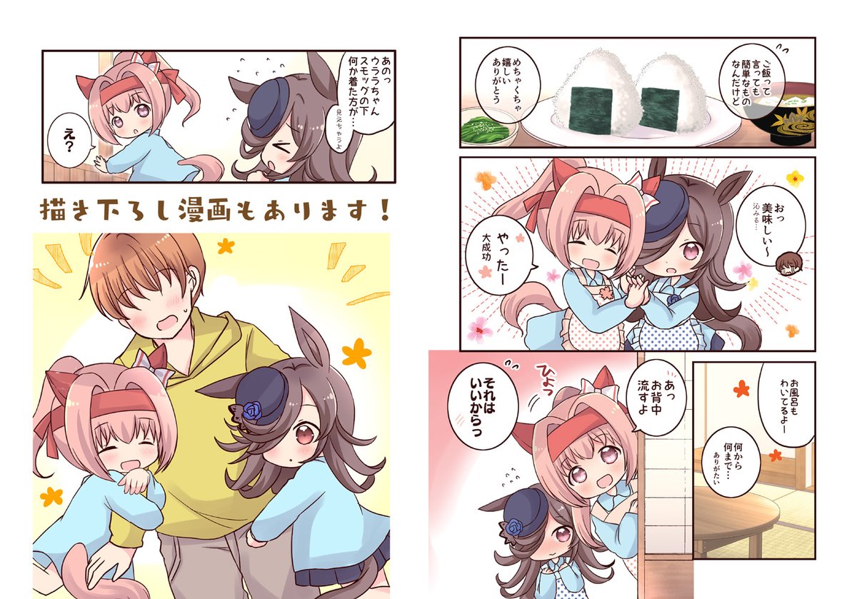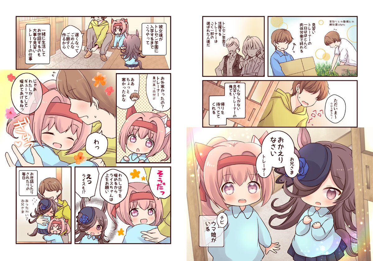 【プリステ23R新刊】見習いトレーナーが小さいウラライスをお育てする漫画のまとめです。本文フルカラーで描き下ろしあります。お手元に置いてくれると嬉しいです🌸🍚メロンさんで予約始まってます【メロンブックス】melonbooks.co.jp/detail/detail.… #六畳一間にウマ娘 #プリステ23R