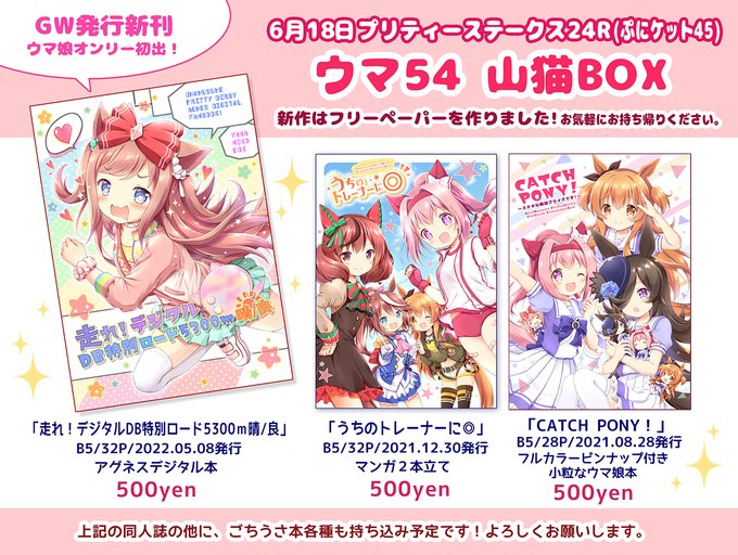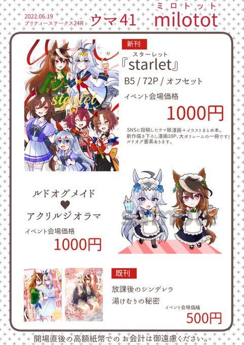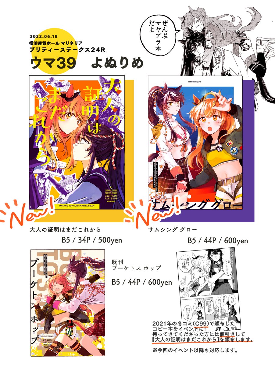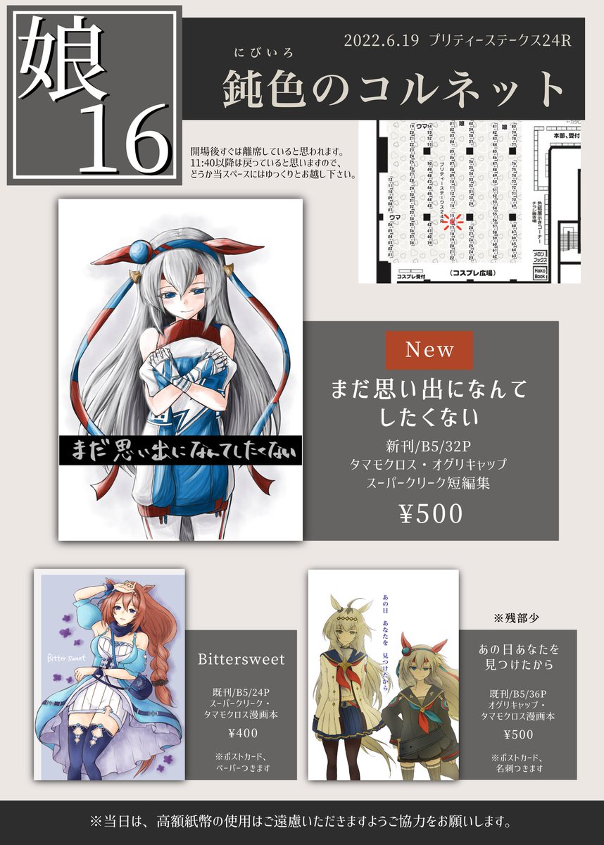 続きです。今週末6/19(日)開催のプリティーステークス24Rで新刊のウマ娘本を「娘04 哀れなウサギ」のスペースで委託頒布してもらいます! ストーリーは蒼葉叶音さんで、漫画を直晴が描きました 🍈melonbooks.co.jp/detail/detail.… 🐯ecs.toranoana.jp/tora/ec/item/0… #ウマ娘 #ウマ娘プリティーダービー #プリステ24R