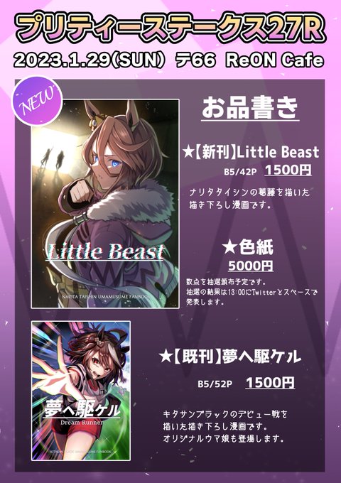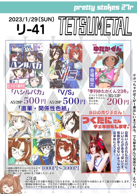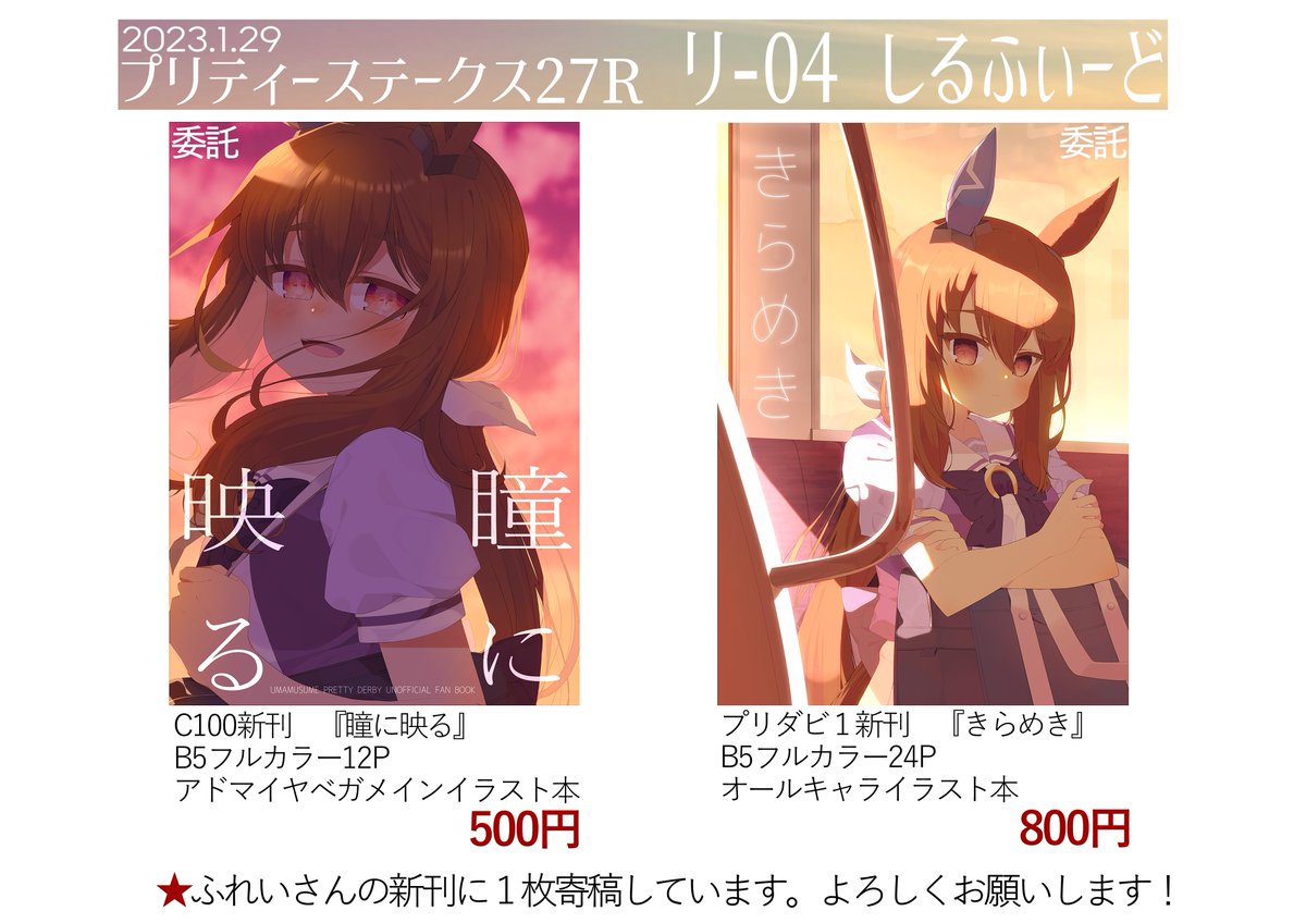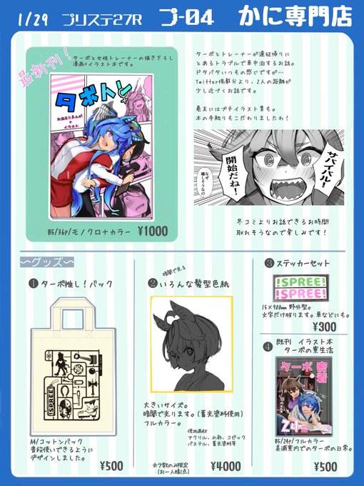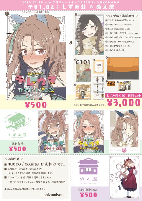 < お知らせ > #プリステ27 2023.01.29.sun テ 01.02 / しずみ荘 & ぬえ屋 明日のプリステ27Rのお品書きです🙌 合体先のぬえ屋さんは諸事情でお休みなのですがC101新刊委託あります! 通販:BOOTH&メロンブックス⇩ 🅱️shizumisou.booth.pm 🍈melonbooks.co.jp/circle/index.p… どうぞ宜しくです🙏✨