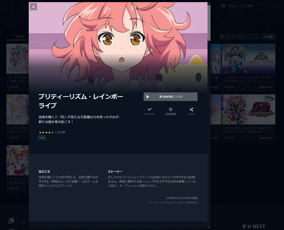 U-NEXTのプリティーリズム・オーロラドリーム~プリパラ3期までの見放題が5月31日で終るみたいです。 特にプリリズ3作をフルHD画質で見放題で見れるのは多分今U-NEXTだけだと思うので、1ヵ月の無料登録期間を使えば無料でBD画質で見れるので未見の方はGW期間などにでも是非 #プリティーシリーズ