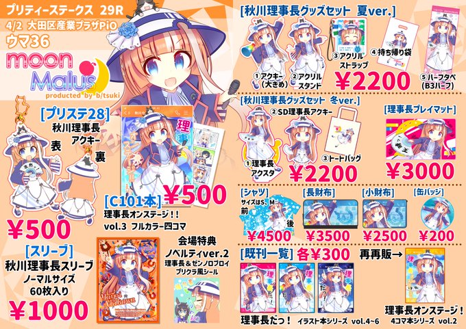4/2に久々東京開催のプリステ29Rのお品書きです! 前回作ったちんまい理事長アクキー持っていきます その他、c101の新刊やスリーブ、お品書きにある既刊・既作も持ち込みます~ #プリステ29R #プリティーステークス29R
