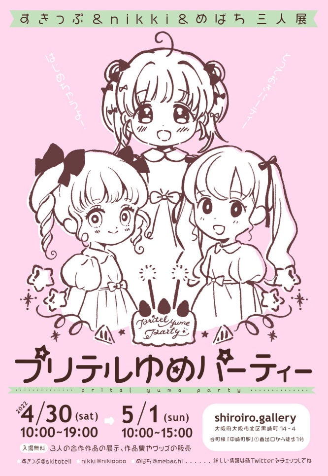 4/30・5/1の2日間、大阪中崎町のshiroiro.ギャラリーにて、すきっぷ @skitotell さん&めばち@mebachi さん&nikki の三人展『 #プリテルゆめパーティー 』を開催します。 詳しい情報は展示HPをご覧ください。 pritel.hp.peraichi.com/yumeparty 🎉🎉🎉