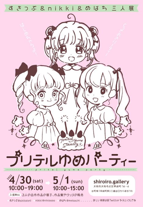 【お知らせ】 4/30と5/1に大阪・中崎町のshiroiro.ギャラリーにて #プリテルゆめパーティー を開催します。すきっぷ(@skitotell) ・nikki(@nikipopo)・めばちによる三人展です。開催時間など詳しくはHPをご覧ください。 pritel.hp.peraichi.com/yumeparty