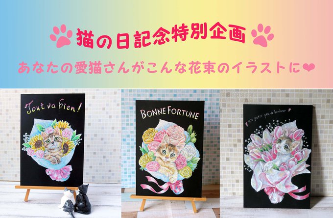 💗😺#猫の日 記念プレゼント企画😺💗 チョークアートの〈しあわせのねこの花束〉ふうのイラストを愛猫さんでお描きします😊 ①フォロー&RT ②愛猫さんのお写真を付けてコメントの上ご応募ください 当選は1名様です😺 #猫 #猫好きさんと繋がりたい #猫イラスト #プレゼント企画開催中