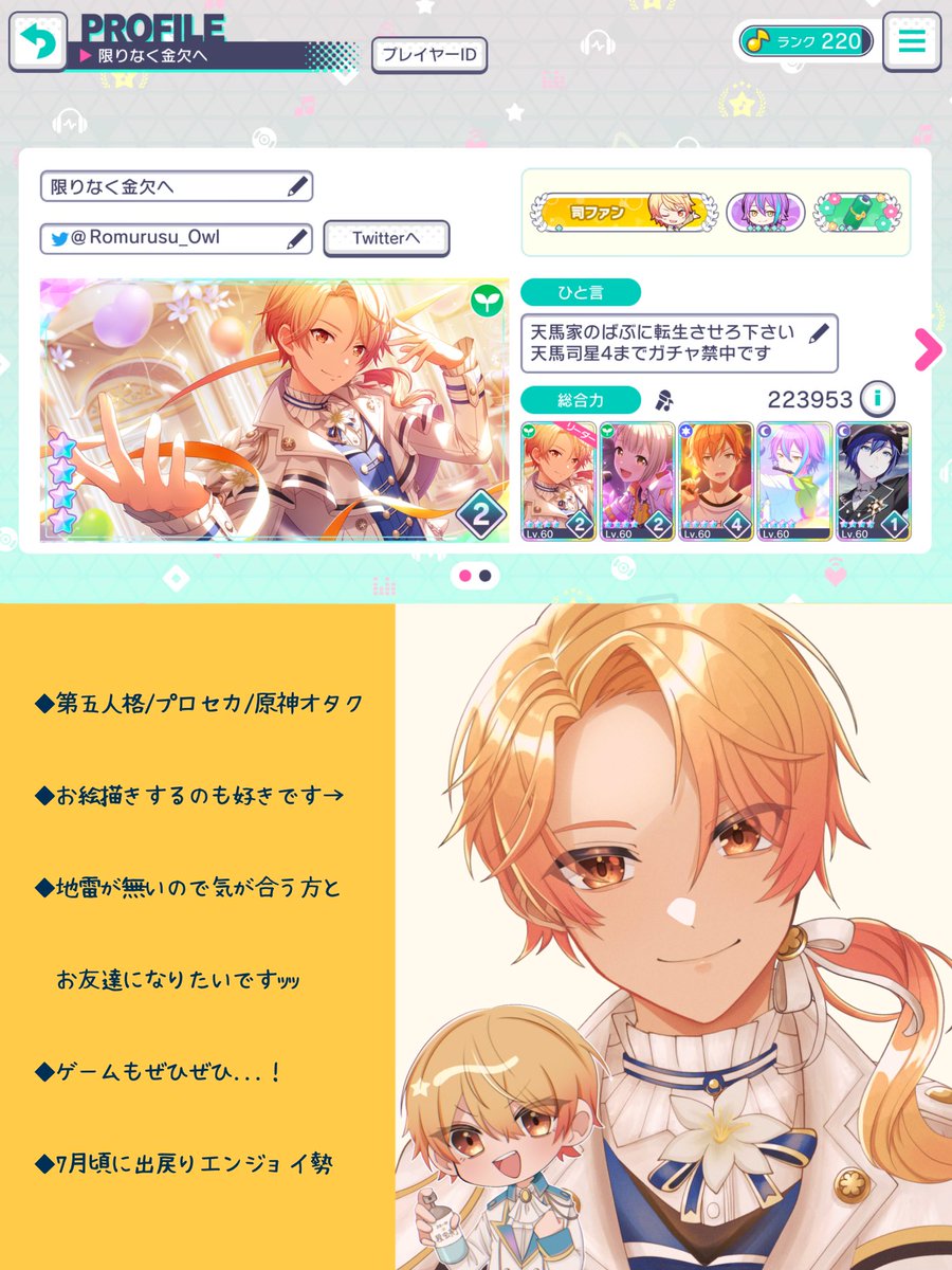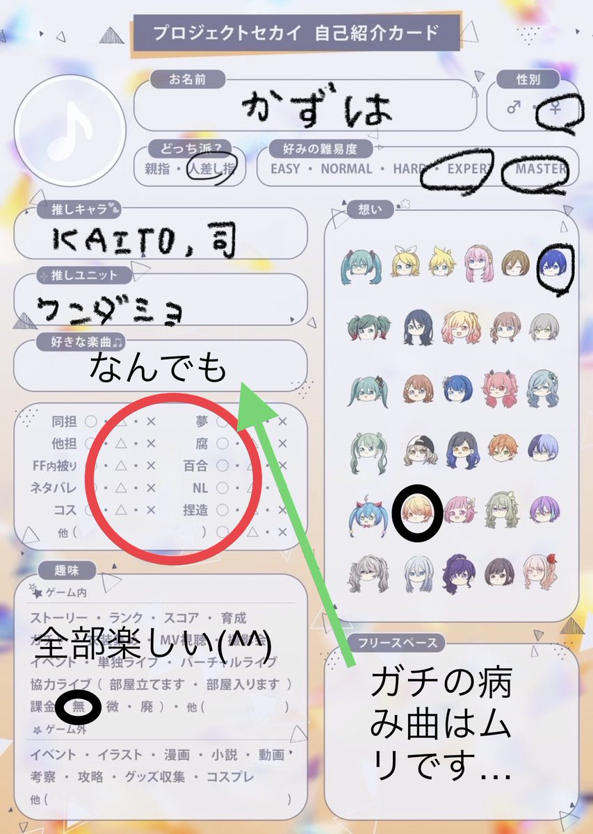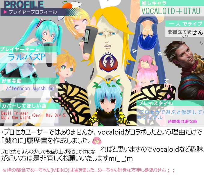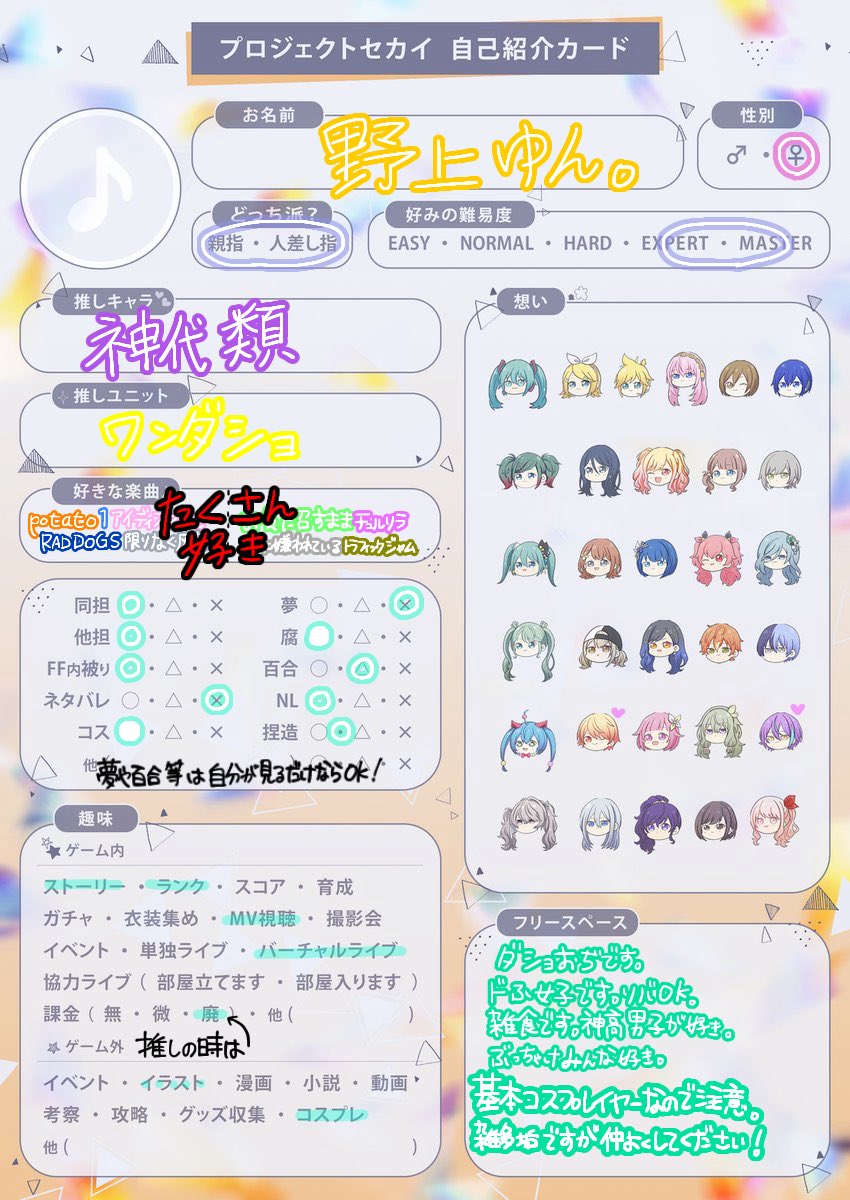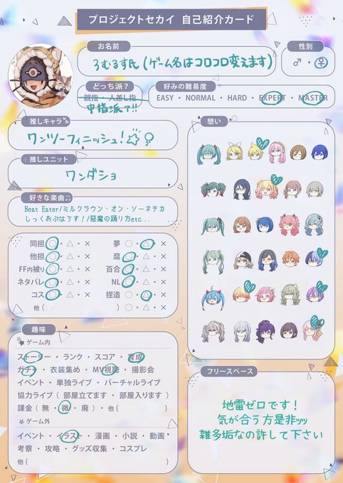テンプレお借りいたしました🙏 最近?ようやく始めれた初心者です🙌 音ゲー大好きマンです。ワンダショ好きです。おぢさんです。コスプレイヤーです。とっても雑多垢なのでそれでも大丈夫って方是非繋がりたいです😊👏 #プロセカ履歴書 #プロセカ好きさんと繋がりたい